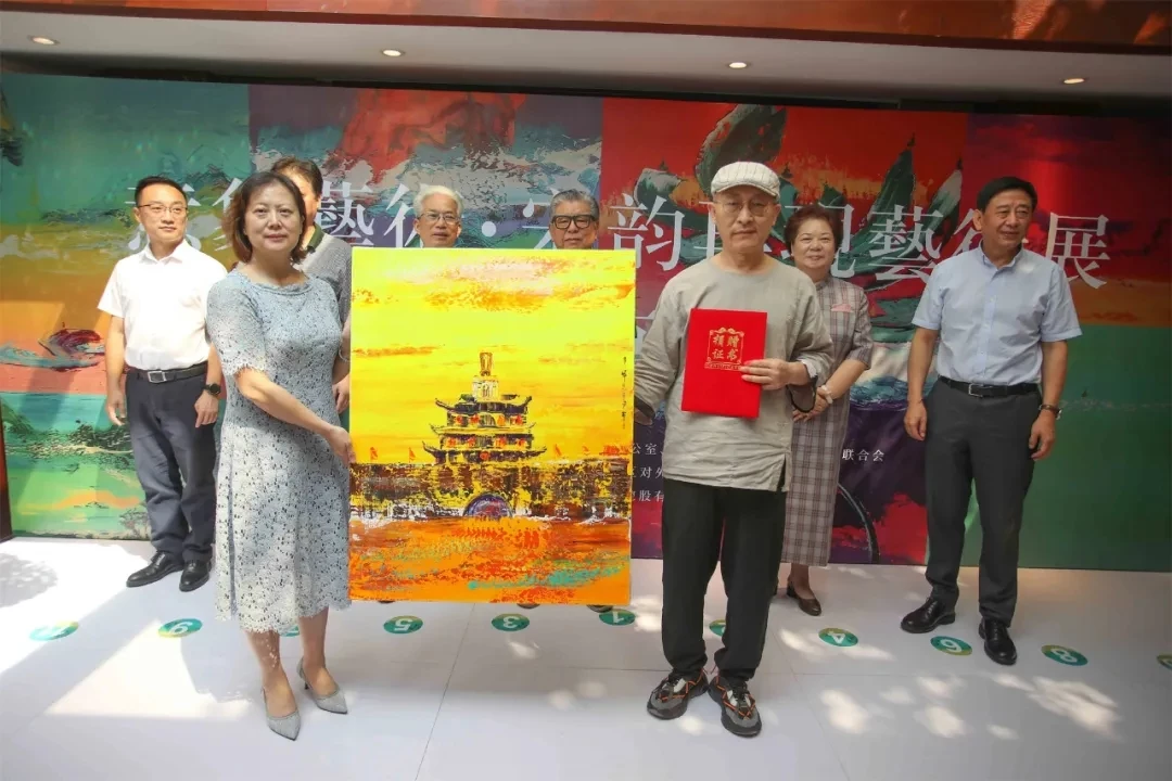 贈(zèng)畫(huà)儀式,將現(xiàn)場(chǎng)的氣氛推到了最高。在中國(guó)關(guān)心下一代工作委員會(huì)常務(wù)副主任胡振民、市對(duì)外交流協(xié)會(huì)會(huì)長(zhǎng)張愛(ài)琴、寧波市文聯(lián)黨組原書(shū)記、副主席鄒大鳴、市關(guān)工委副主任劉永成、海曙區(qū)關(guān)工委主任陳志國(guó)、海曙區(qū)人民政府副區(qū)長(zhǎng)王懿棟的共同見(jiàn)證下,朱神光老師將作品《鼓樓 ·際會(huì)》捐贈(zèng)與海曙區(qū)檔案館,海曙區(qū)檔案館代表為朱神光老師頒發(fā)了收藏證書(shū)。
