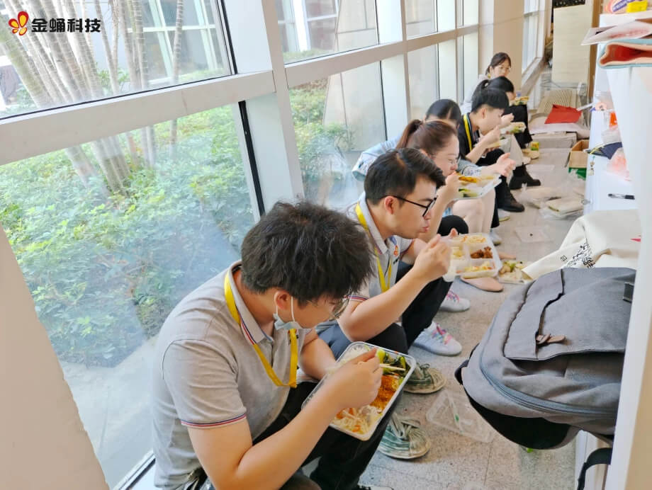 由于金蛹的智能產(chǎn)品在展會(huì)上引人注目,每天都有很多法師蒞臨,小伙伴們忙著接待,經(jīng)常顧不上吃飯。他們就趁著人流量不是很大時(shí)錯(cuò)峰吃飯,捧著盒飯坐在窗邊的地上,囫圇吃完,接著工作。